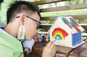 活動(dòng)現(xiàn)場,各個(gè)家庭可謂各顯神通。他們有的用彩筆為鳥巢涂色,有的則用帶有葉子的藤條裝扮鳥巢,有的則在鳥巢上寫下愛護(hù)鳥類的美好心愿。