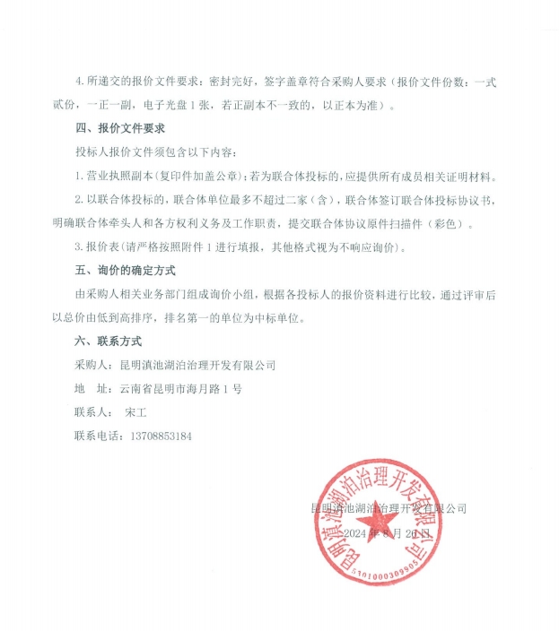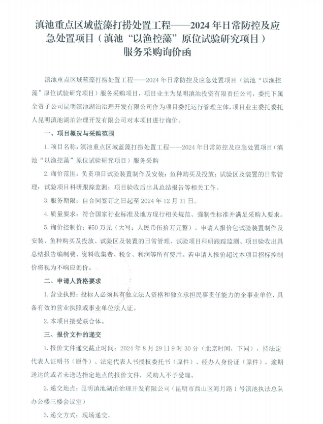 滇池重點(diǎn)區(qū)域藍(lán)藻打撈處置工程--2024年日常防控及應(yīng)急處置項(xiàng)目(滇池“以漁控藻”原位試驗(yàn)研究項(xiàng)目)服務(wù)采購(gòu)詢價(jià)函